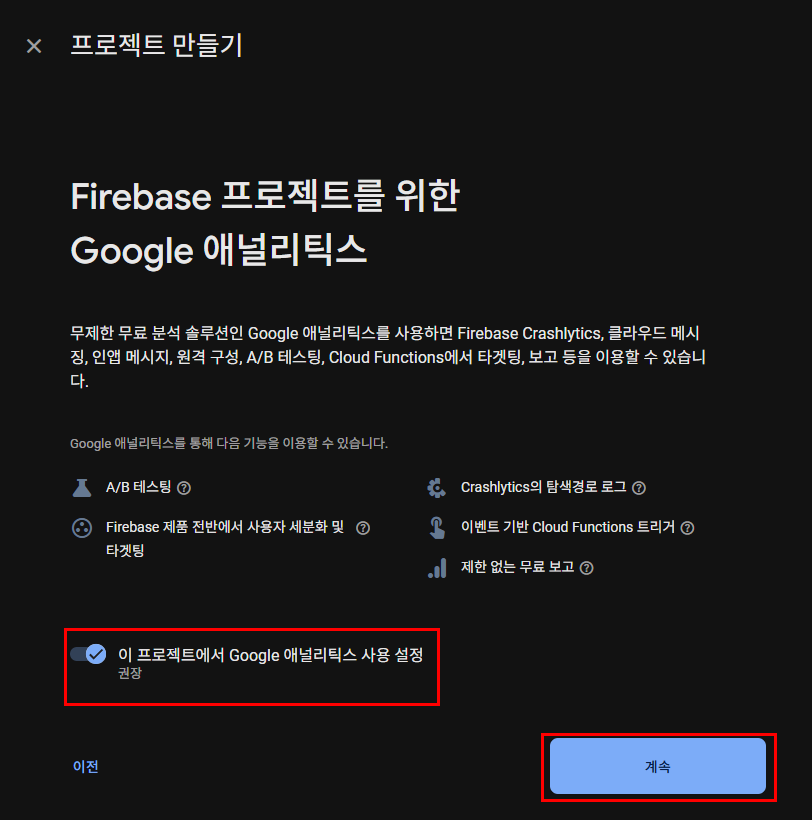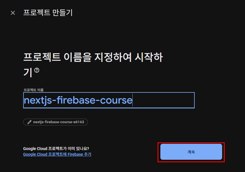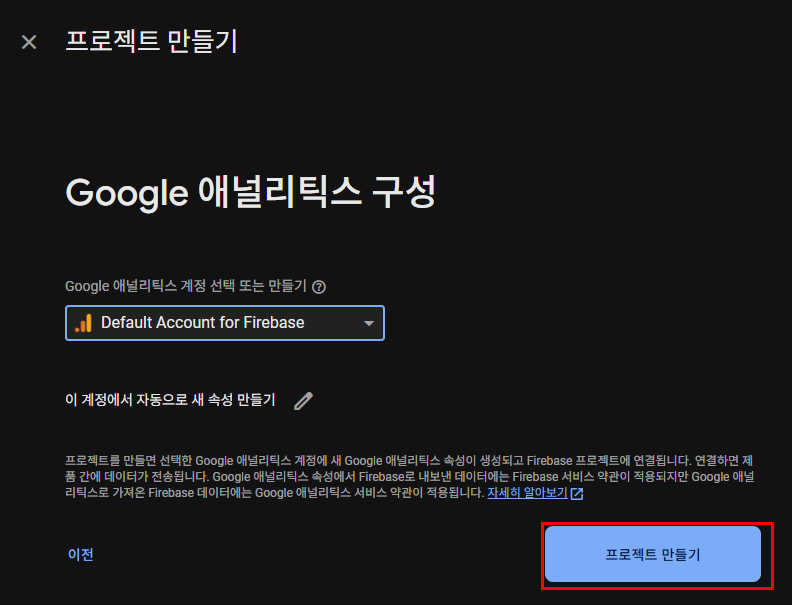 - [console.firebase.google.com]์์ ์ ํ๋ก์ ํธ ์์ฑ (์: