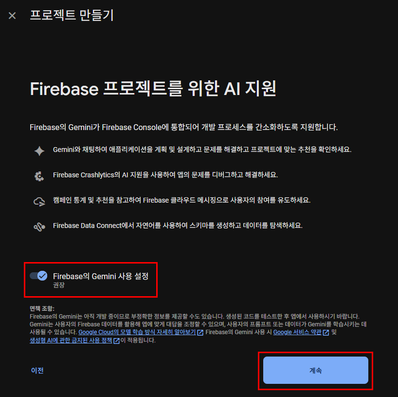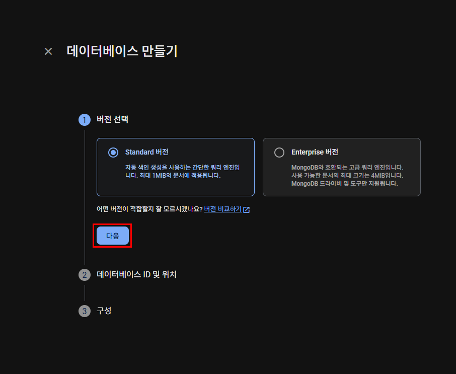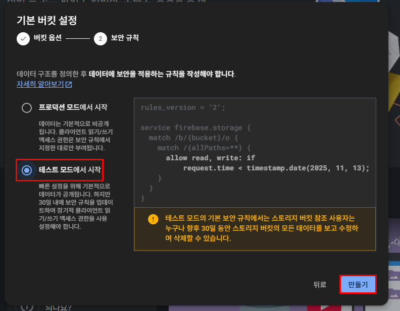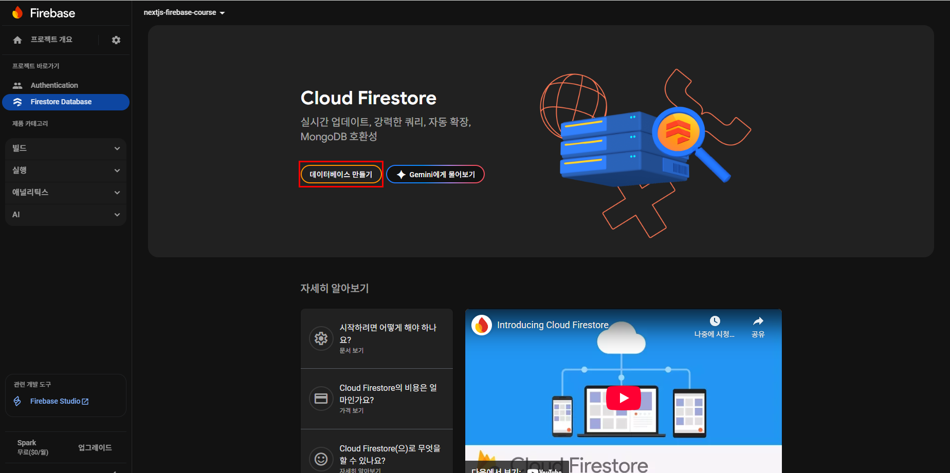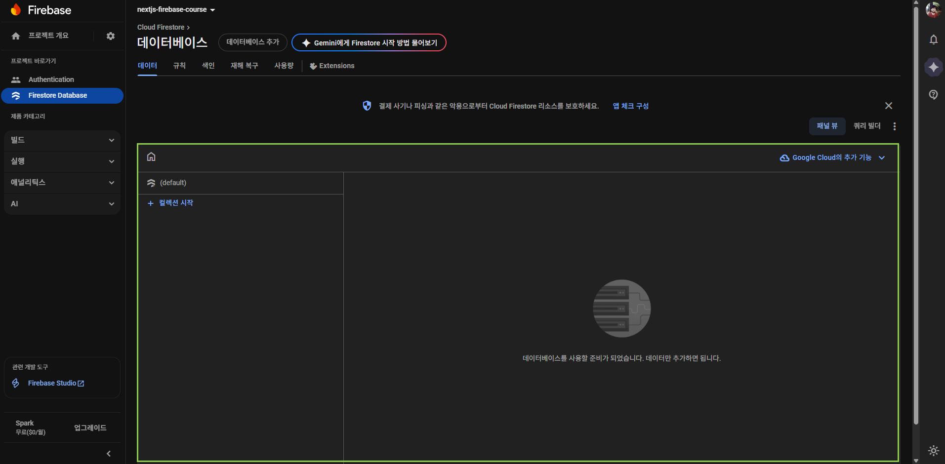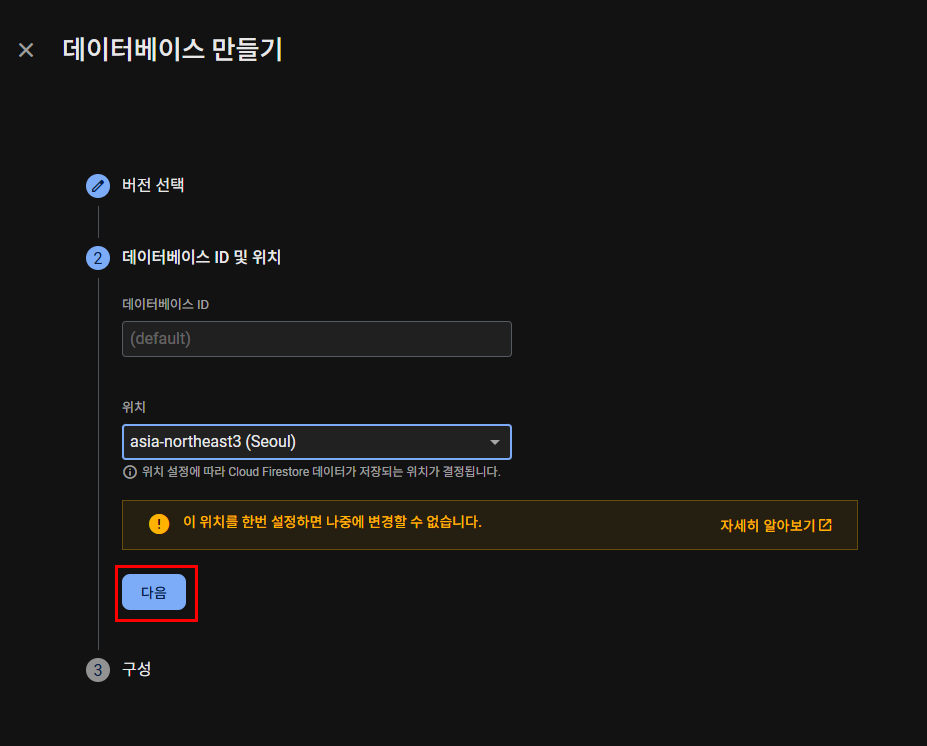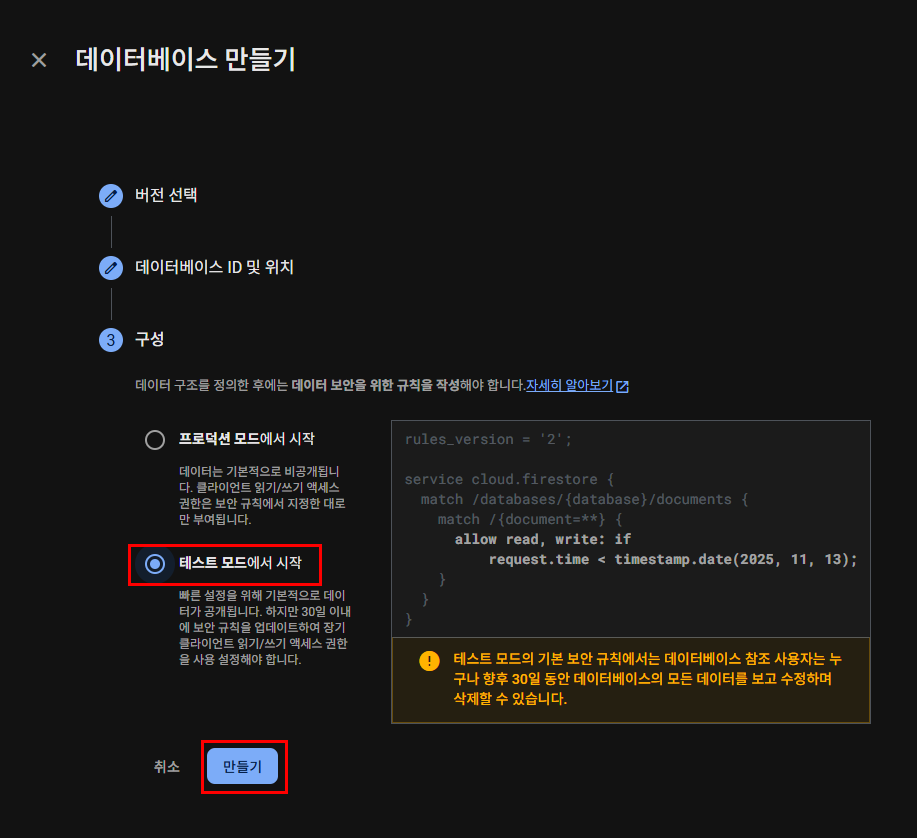 - Firestore โ ๋ฐ์ดํฐ๋ฒ ์ด์ค ๋ง๋ค๊ธฐ โ ๋ชจ๋: ํ ์คํธ(๊ฐ๋ฐ ๋จ๊ณ) โ ์์น: asia-northeast3(์์ธ)