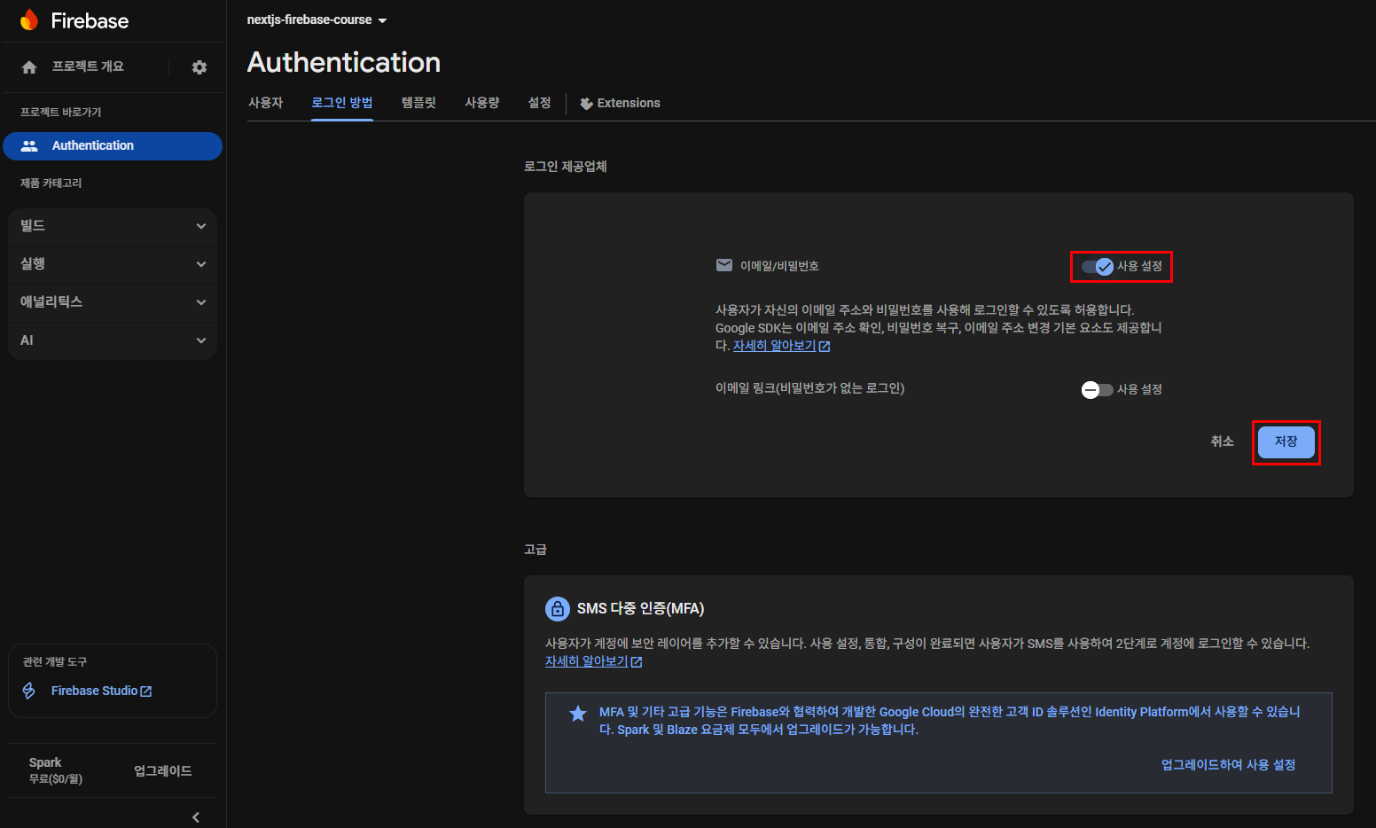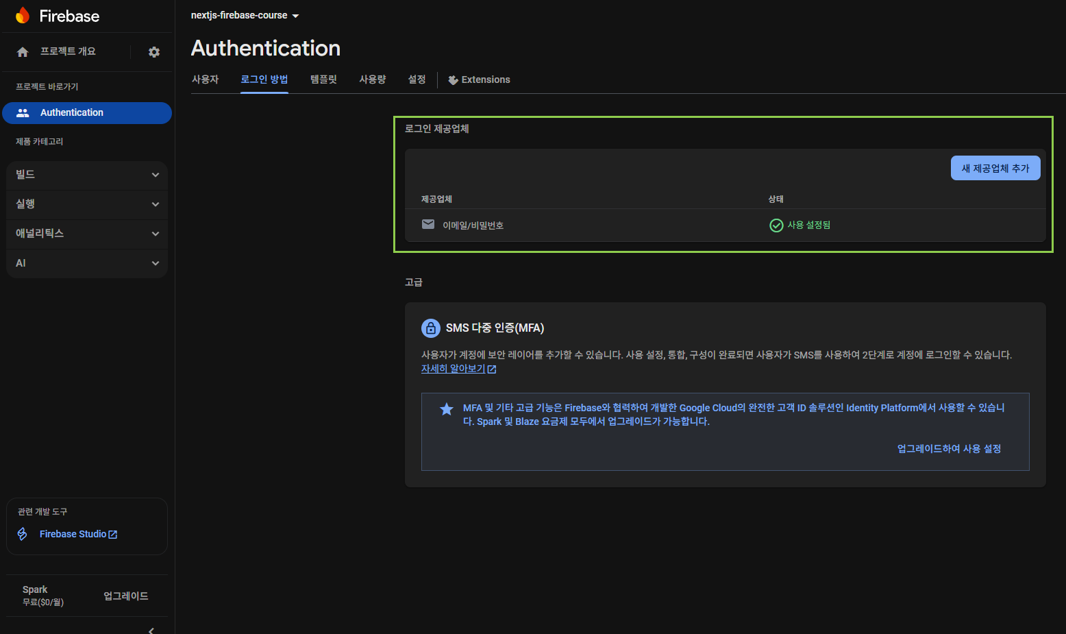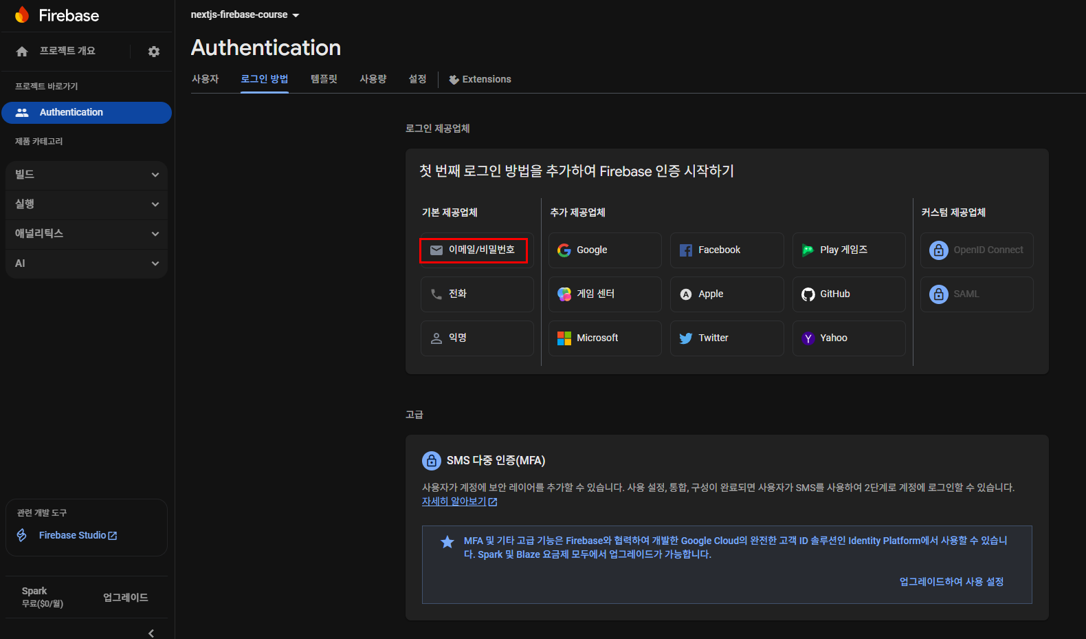 nextjs-firebase-course) - Authentication โ Sign-in method โ Email/Password ํ์ฑํ(+ Google Sign-in์ 3๊ฐ์์)