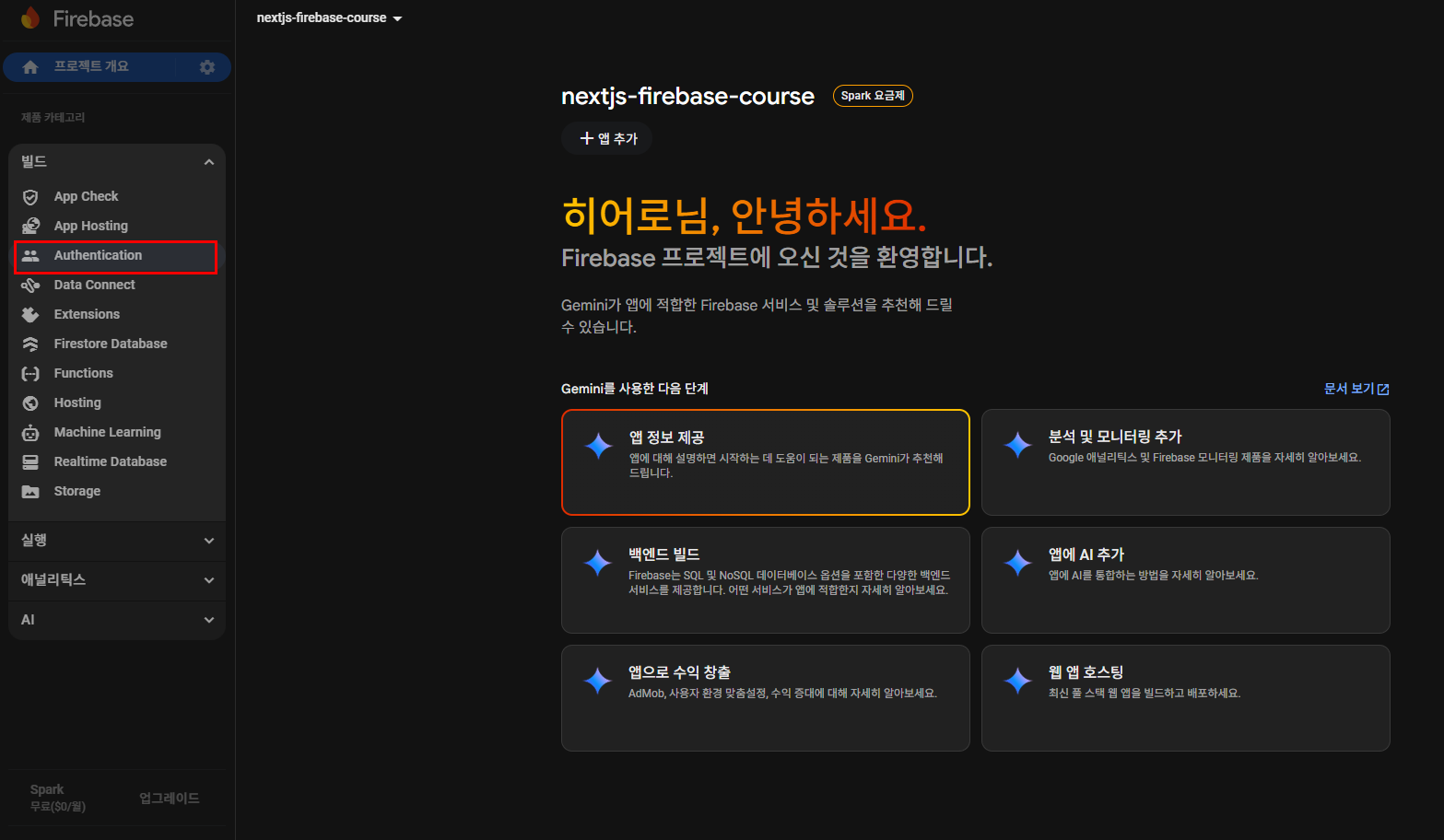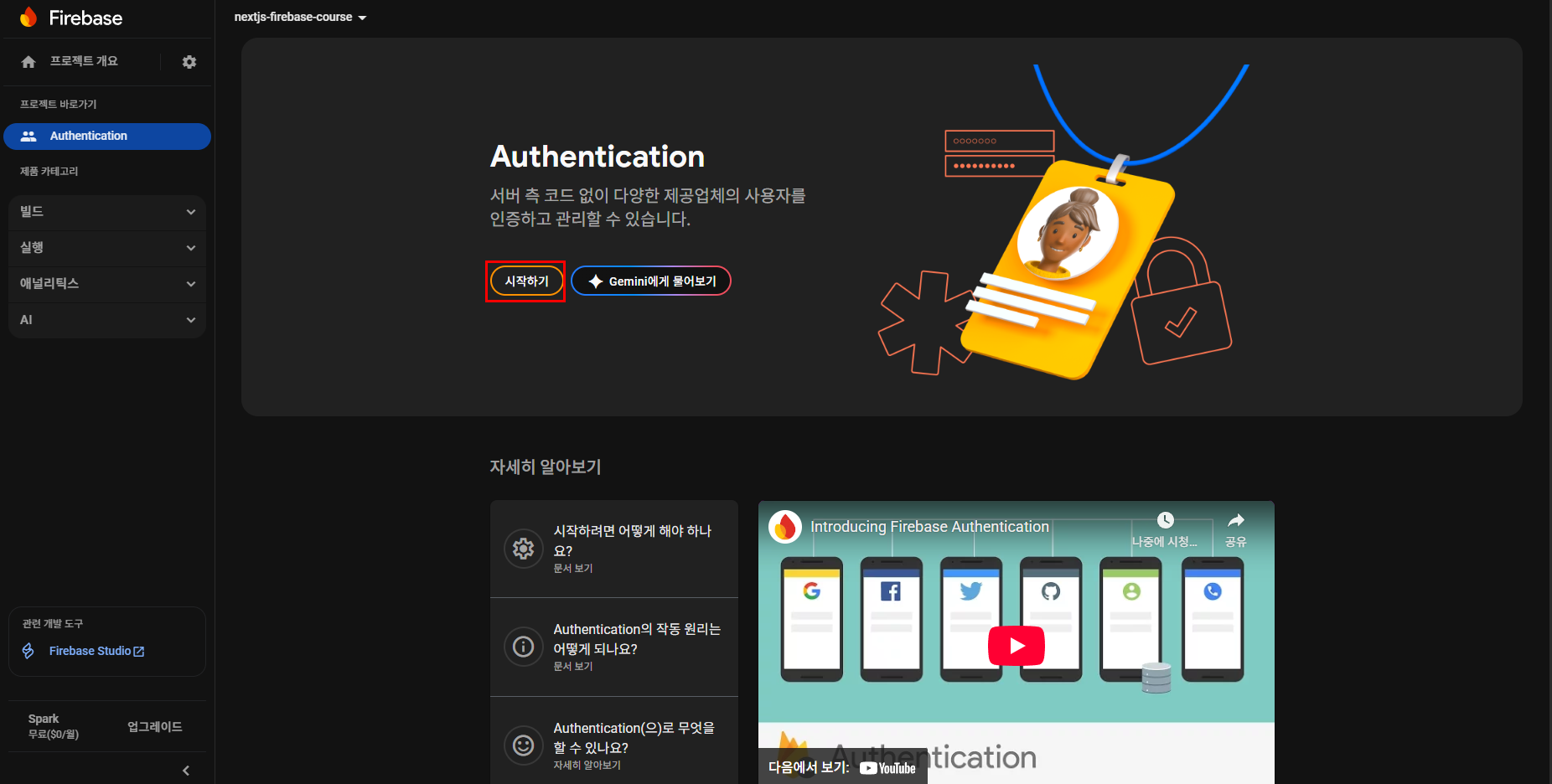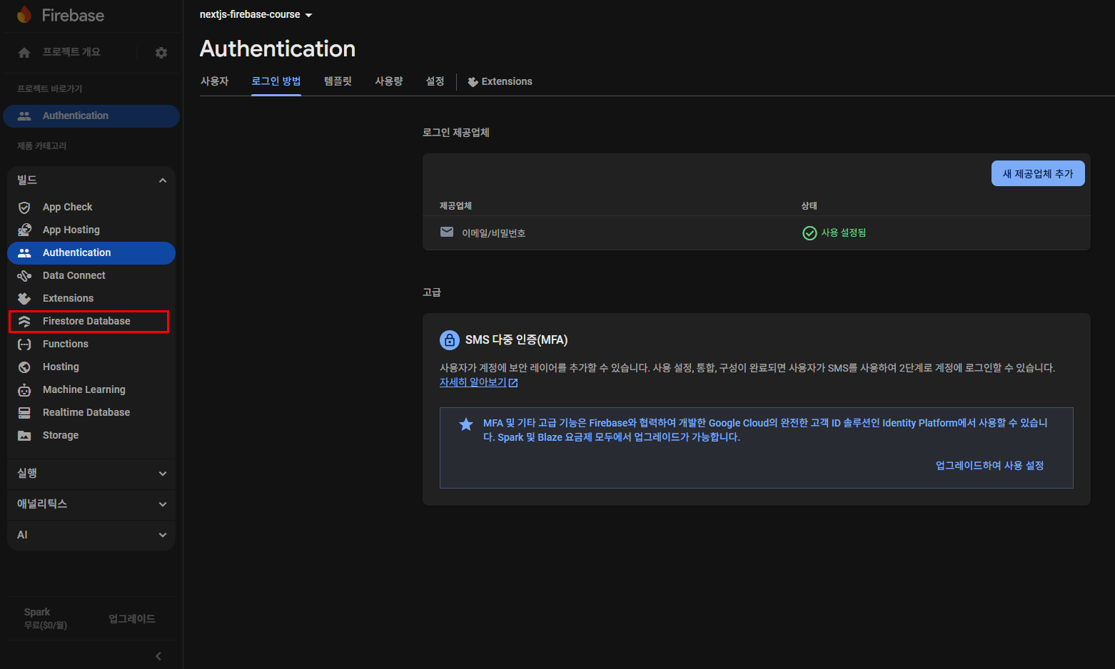 nextjs-firebase-course) - Authentication โ Sign-in method โ Email/Password ํ์ฑํ(+ Google Sign-in์ 3๊ฐ์์)