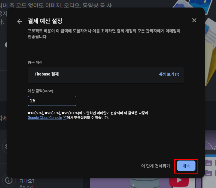 Cloud Billing ๊ฒฐ์ ๊ณ์ ์ฐ๋์ ์ํด์ ํ๋ก์ ํธ ์ ๊ทธ๋ ์ด๋๋ฅผ ํฉ๋๋ค. Cloud Billing ๊ฒฐ์ ๊ณ์ ์์ฑ ๊ณผ์ ์ ์๋ตํ๊ฒ ์ต๋๋ค. ํด์ธ ๊ฒฐ์ ๊ฐ ๊ฐ๋ฅํ ์นด๋ ์ฐ๋์ด ํ์ํ๋ฉฐ ์ค์ต์ ์ํ ์คํ ๋ฆฌ์ง ๋น์ฉ์ ์ฐ๋ํด๋ ๋๋์ผ๋ก ์ด๋ฏธ์ง๋ฅผ ์ฌ๋ฆฌ์ง ์๋ ์ด์ ๋น์ฉ ๊ฒฐ์ ๊ฐ ๊ฑฐ์ ๋์ง ์์ผ๋ ์ฐธ๊ณ ํด์ฃผ์ธ์. (๋ณด์ ์ค์ ๋ ์ค์ํฉ๋๋ค. ์ด ๋ถ๋ถ์ ์คํ ๋ฆฌ์ง ๋ถ๋ถ ๊ฐ์๋ฅผ ์งํํ๋ฉด์ ๋ ์ค๋ช ํ๊ฒ ์ต๋๋ค.)