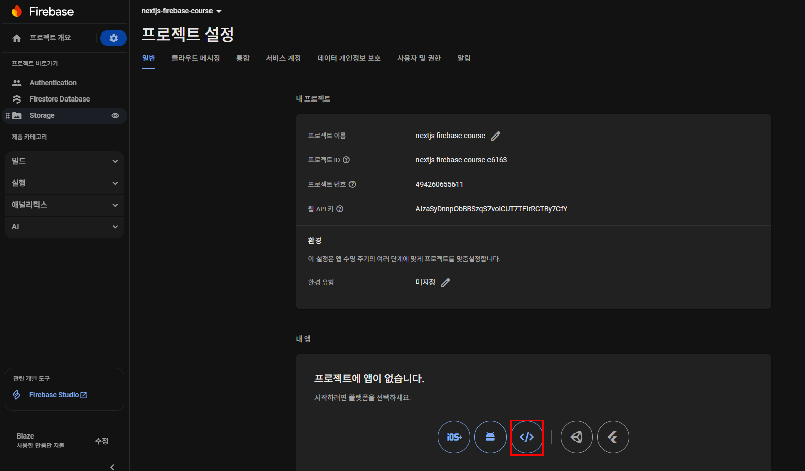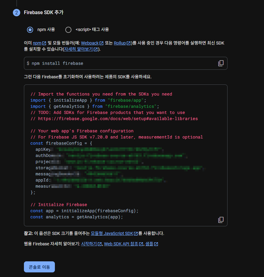 Firebase SDK snippet์์apiKey๋ฑ ์ค์ ๊ฐ ํ์ธ