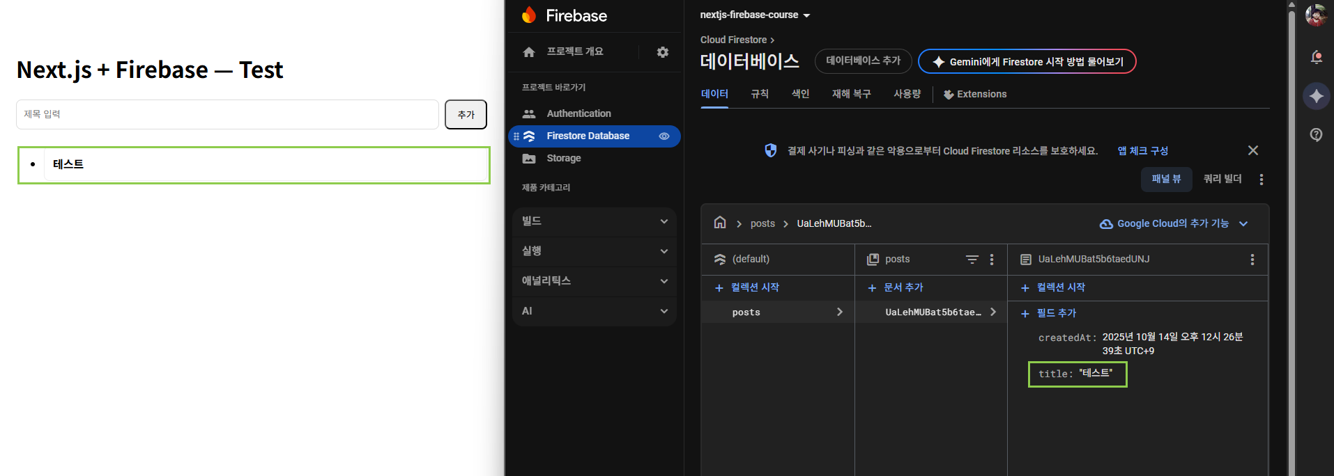 .env.localํ๊ฒฝ๋ณ์ ์ค์ firebase.client.ts์ด๊ธฐํ ํ์ผ ๊ตฌ์ฑ- Firestore์ ํ ์คํธ ๋ฐ์ดํฐ ์ฐ๊ธฐ/์ฝ๊ธฐ๊น์ง ํ์ธ