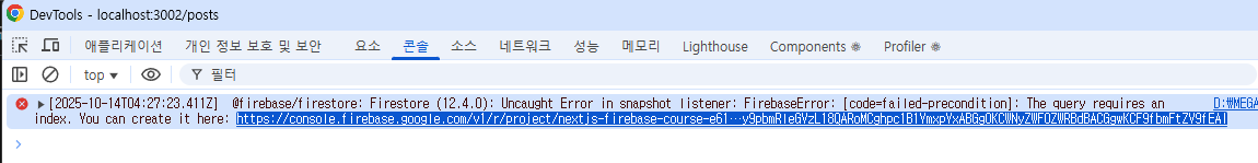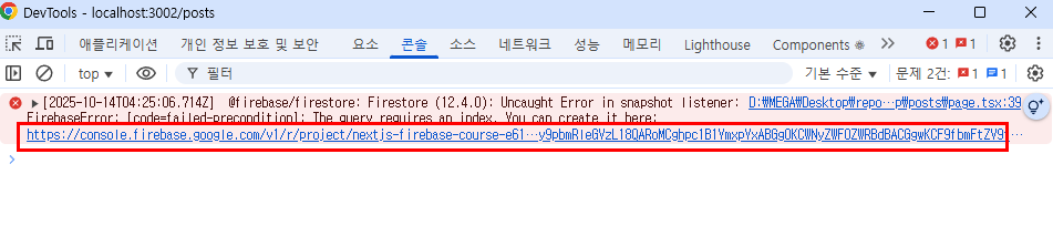์ด ์๋ฌ๋ Firestore๋ฅผ ๋ค๋ฃจ๋ค๋ณด๋ฉด ์์ฃผ ๋๋ ์๋ฌ๋ก ํด๊ฒฐ์ฑ ์ ์ฝ์์ ์๋ฌ ๋งํฌ๋ฅผ ํด๋ฆญํด์ Firestore ๋ณตํฉ ์ธ๋ฑ์ค๋ฅผ ์์ฑํ๋ฉด ๋ฉ๋๋ค.