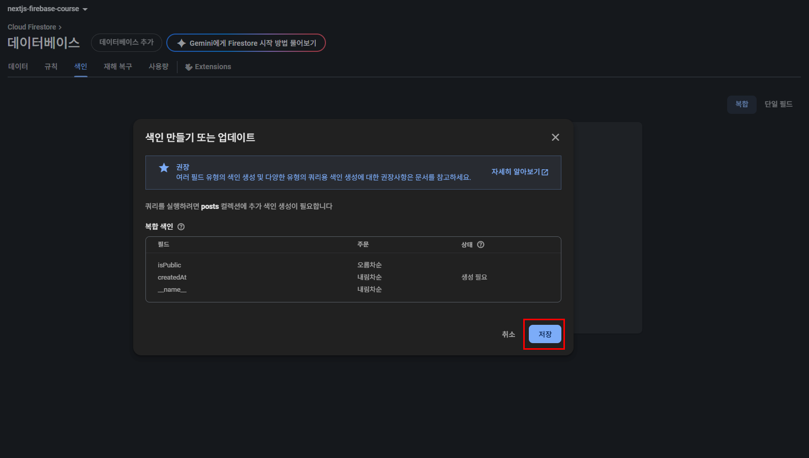 ๋ค์ ์๋ฌ๋ Firestore ๋ณตํฉ ์ธ๋ฑ์ค๊ฐ ์์ด ์ฟผ๋ฆฌ๋ฅผ ์คํํ ์ ์๋ค๋ ๋ป์ ๋๋ค.