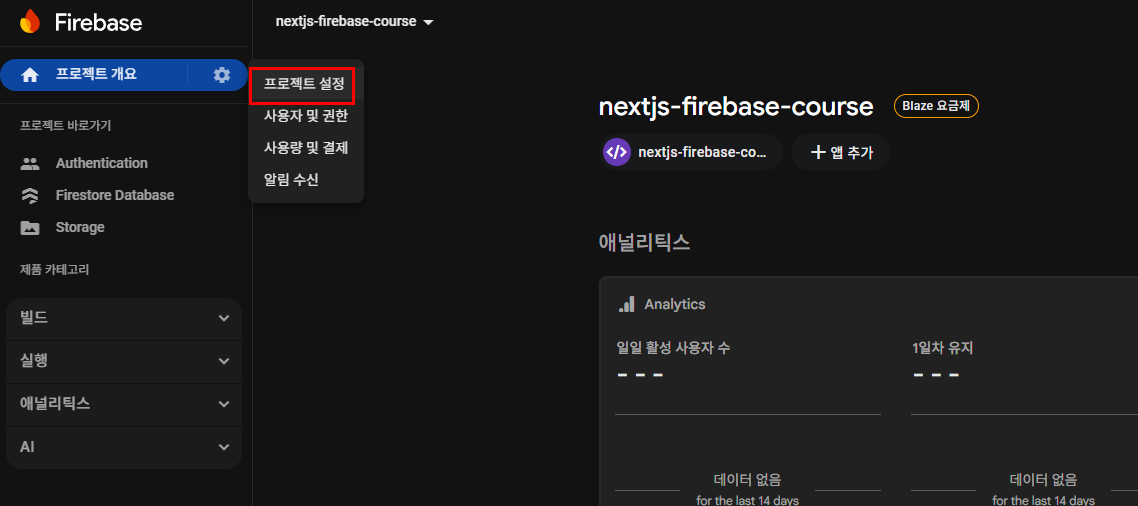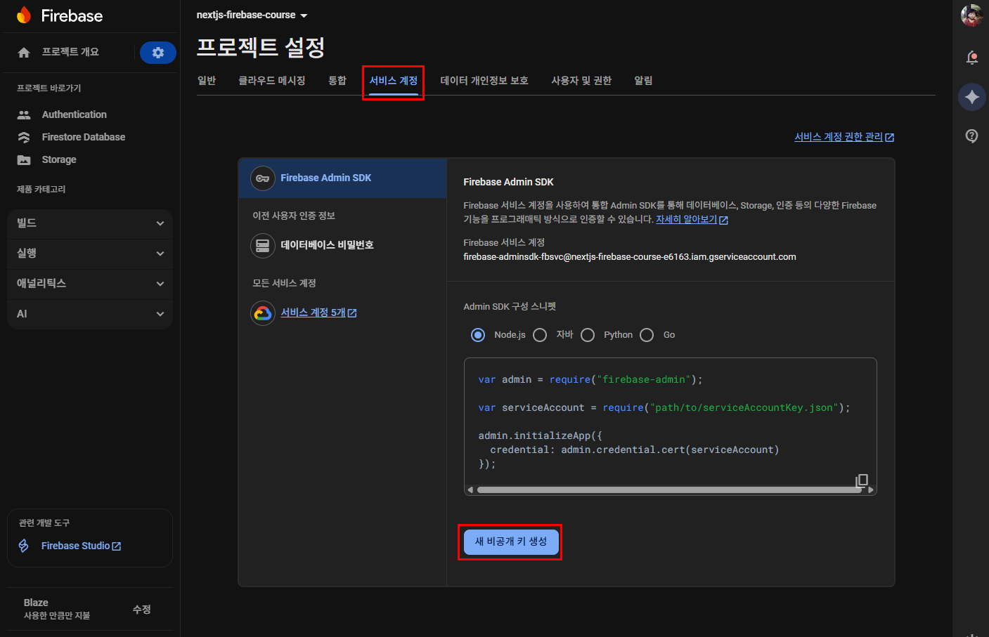 โ ์๋น์ค ๊ณ์ ํค๋ Firebase ์ฝ์ > ํ๋ก์ ํธ ์ค์ > ์๋น์ค ๊ณ์ ์์ ๋ฐ๊ธํฉ๋๋ค.