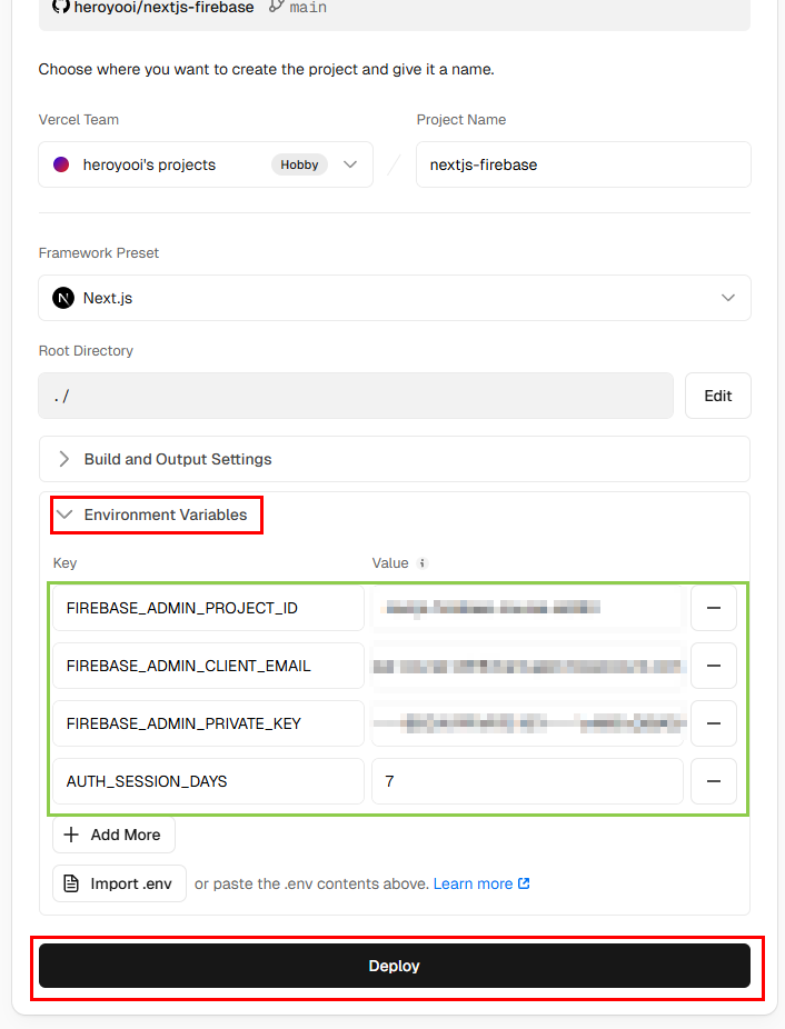 Vercel ์์๋ ์ ์ฅ์์์ ํ์ธ๋๋ ํ๋ ์์ํฌ๋ค์ ์๋์ผ๋ก ์ธ์ํฉ๋๋ค. Framework Preset์ Next.js๋ก ์๋์ผ๋ก ์กํ๋ฉฐ ํ๊ฒฝ ๋ณ์๋ค๋ง ์ธํ ํด์ ๋ฐฐํฌํด์ค๋๋ค.