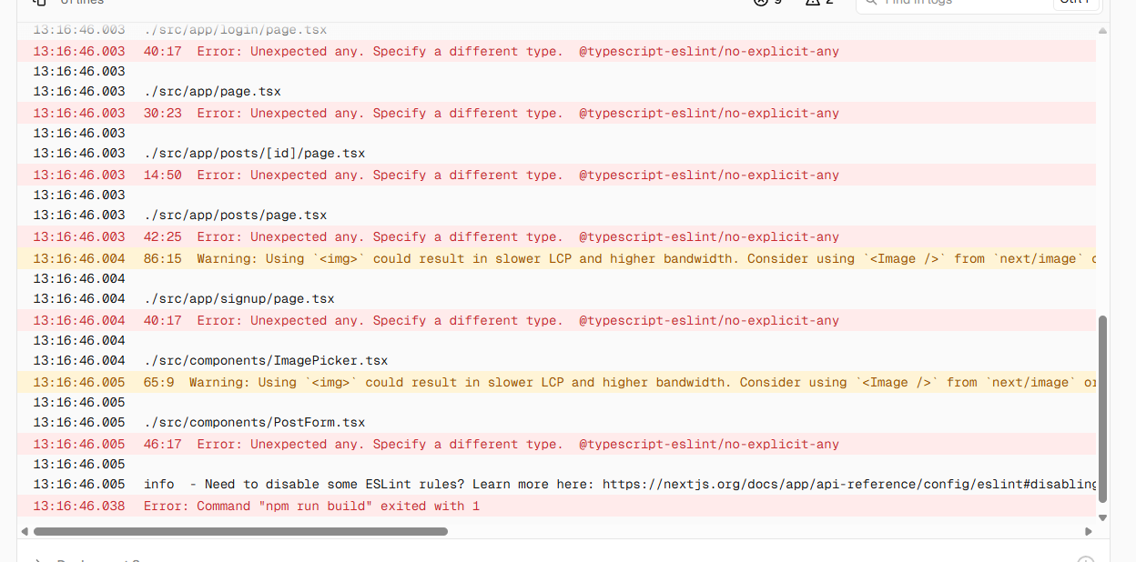 ์ด๊ฑด Vercel ๋น๋ ์ค TypeScript + ESLint ๊ท์น(no-explicit-any) ๋๋ฌธ์ ๋น๋๊ฐ ์คํจํ ์ผ์ด์ค์