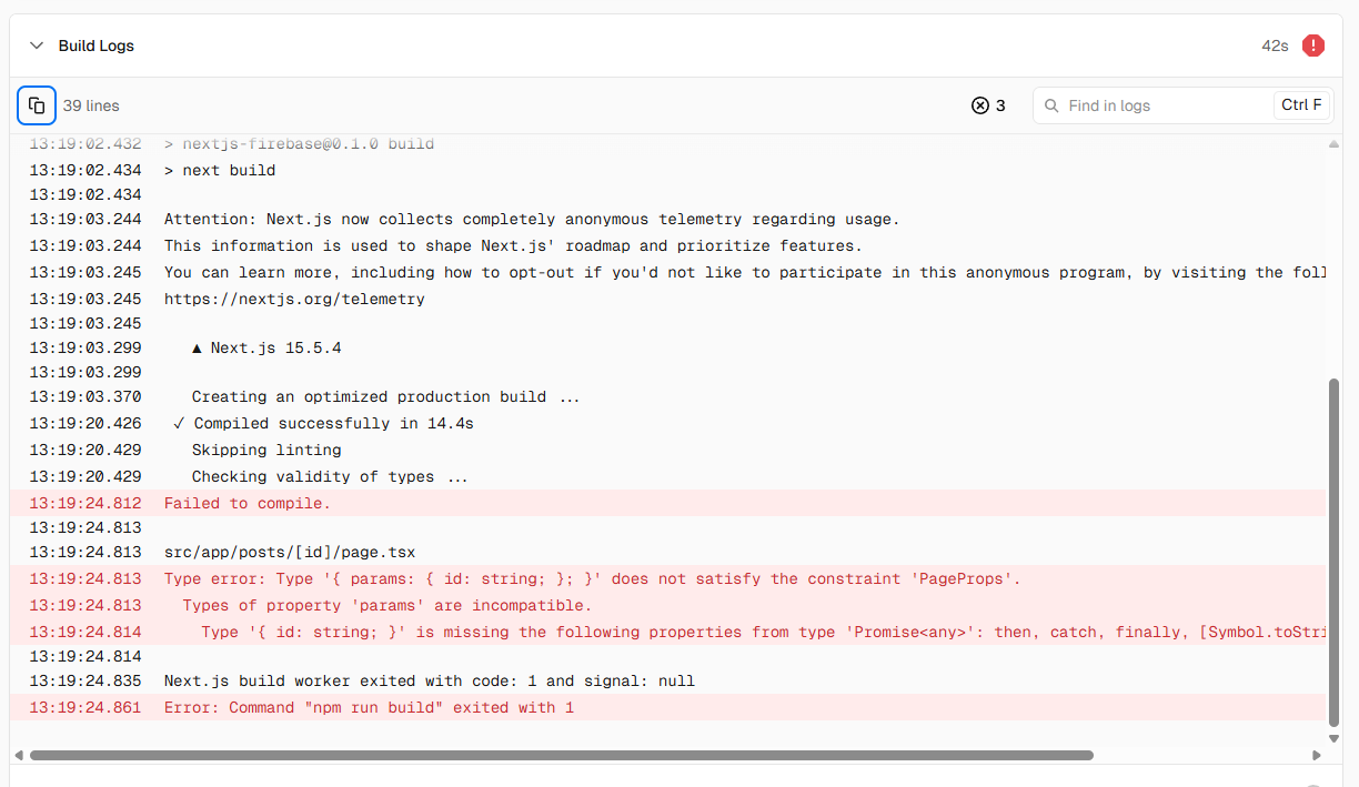 ESLint๋ฅผ ๋นํ์ฑํํ๊ณ ๋ฐฐํฌ๋ฅผ ์๋ํ๋ฉด ๋ค์๊ณผ ๊ฐ์ ์๋ฌ๋ก ๋ฐ๋๋๋ค.